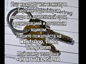 Жильё в Берлине Без посредников. 1. Сдаётся большая квартира (150 м2) для проживания сроком на 1-2 года. Большие комнаты, кухня, 2 санузла, терраса. 2. Сдается 2-комнатная квартира в районе Лихтенберг, в 3 минутах ходьбы от S-Bahn и U-Bahn, 2 раздельные комнаты с балконом, ванная, кухня, квартира укомплектована бытовой техникой. 3. Сдаётся комната в 2-комнатной квартире в районе Лихтенберг, в 3 минутах ходьбы от S-Bahn и U-Bahn, 2 раздельные комнаты с балконом, ванная, кухня, квартира укомплектована бытовой техникой. 4. Сдаются комнаты в Берлине на 2,3,4 человека на длительный срок. Обращаться по телефону или WhatsApp.